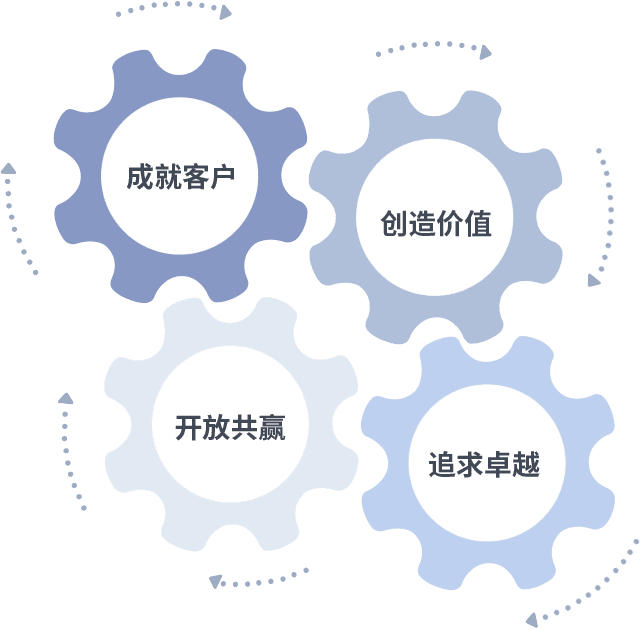 成就客户是一切决策的出发点,,创造价值是衡量所有工作的标准,,追求卓越是我们做事做人的态度,,,开放共赢是我们的格局也是最终的结果。。。。价值观的齿轮环环相扣,,,,推动着组织里的每个人不断向前。。