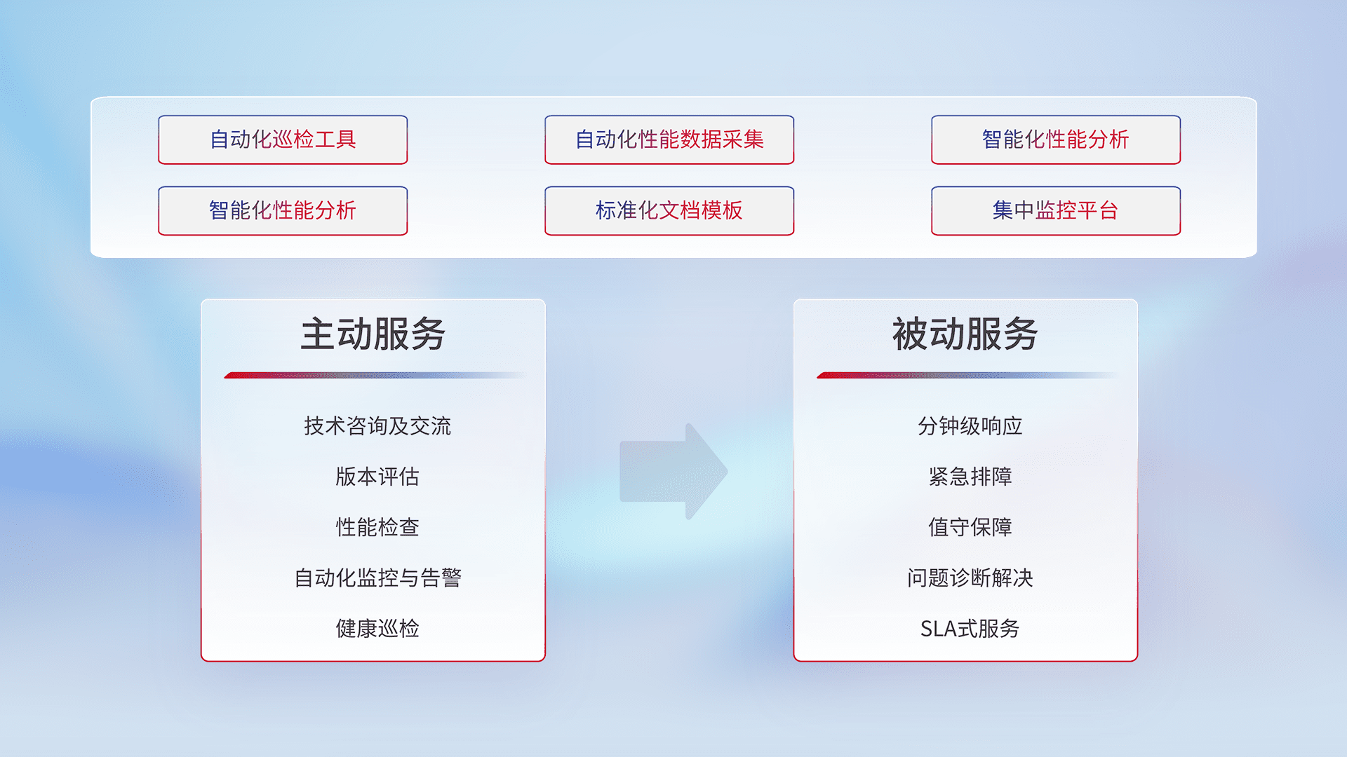 智能化工具和标准化文档,,,保障服务质量,,,提供主动服务(包含技术咨询、、、、版本评估、、、、性能检查、、、、自动化监控与告警、、、、健康巡检)和被动服务包含(分钟级响应、、紧急排障、、、值守保障、、、问题诊断解决、、、、SLA服务)。。。。